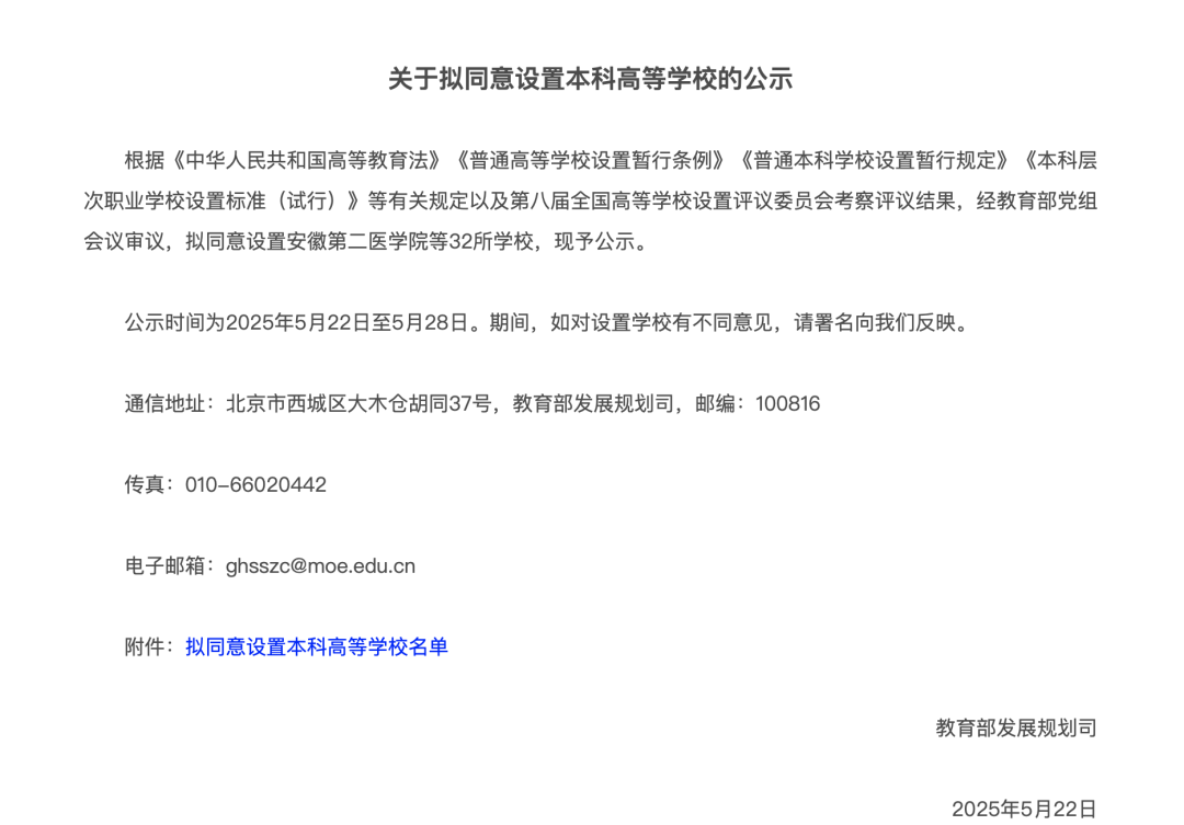 5月22日,教育部发布《关于拟同意设置本科高等学校的公示》,根据《中华人民共和国高等教育法》《普通高等学校设置暂行条例》《普通本科学校设置暂行规定》《本科层次职业学校设置标准(试行)》等有关规定以及第八届全国高等学校设置评议委员会考察评议结果,经教育部党组会议审议,拟同意设置安徽第二医学院等32所学校。其中,拟同意在佛山设立顺德职业技术大学。公示时间为2025年5月22日至5月28日。