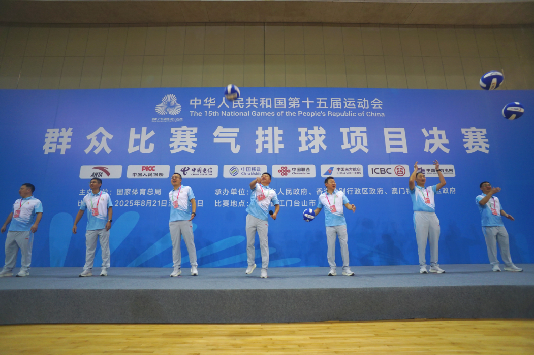 8月21日上午,十五运会群众比赛气排球项目决赛在江门台山市新宁体育馆正式开赛,是十五运会江门赛区首个开赛项目。运动员代表与裁判员代表分别宣誓,承诺恪守体育道德与竞赛规则。在全场热烈的掌声中,领导嘉宾共同为比赛开球。