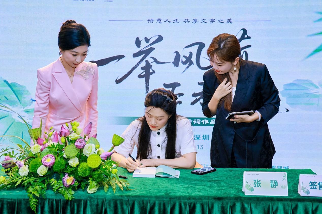 诗集《一举风荷正未央》由浙江文艺出版社近日出版,共收录了张静女士创作的300首诗歌,全书主题分明,是作者多年对自然的认知和对生活的感悟。分享会上,作者张静女士分享了创作心路历程,演唱了昆曲牡丹亭·寻梦·懒画眉,吟唱了诗经中《关雎》,和诗词爱好者互动、回答他们提出的问题,和主持人任星燃同台吟诵作品,并向深圳书城罗湖城赠送签名诗集,由书城专柜收藏,最后向嘉宾和在书城购买诗集的诗词爱好者签名……整个活动流程丰富多彩,既传承了中国古代的优秀文化,又展现了张静女士多才多艺的风采,给与会者和网上观看直播的网友留下深刻印象。