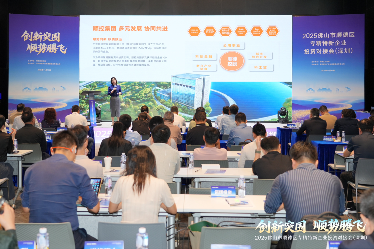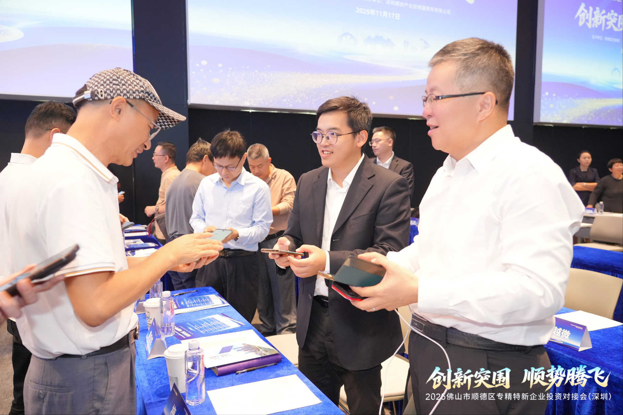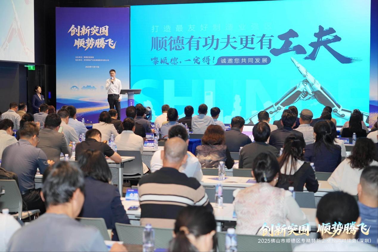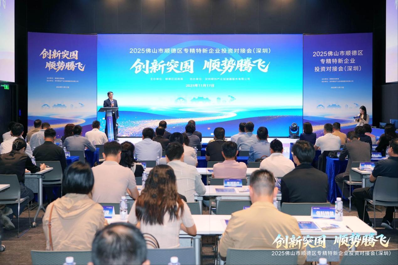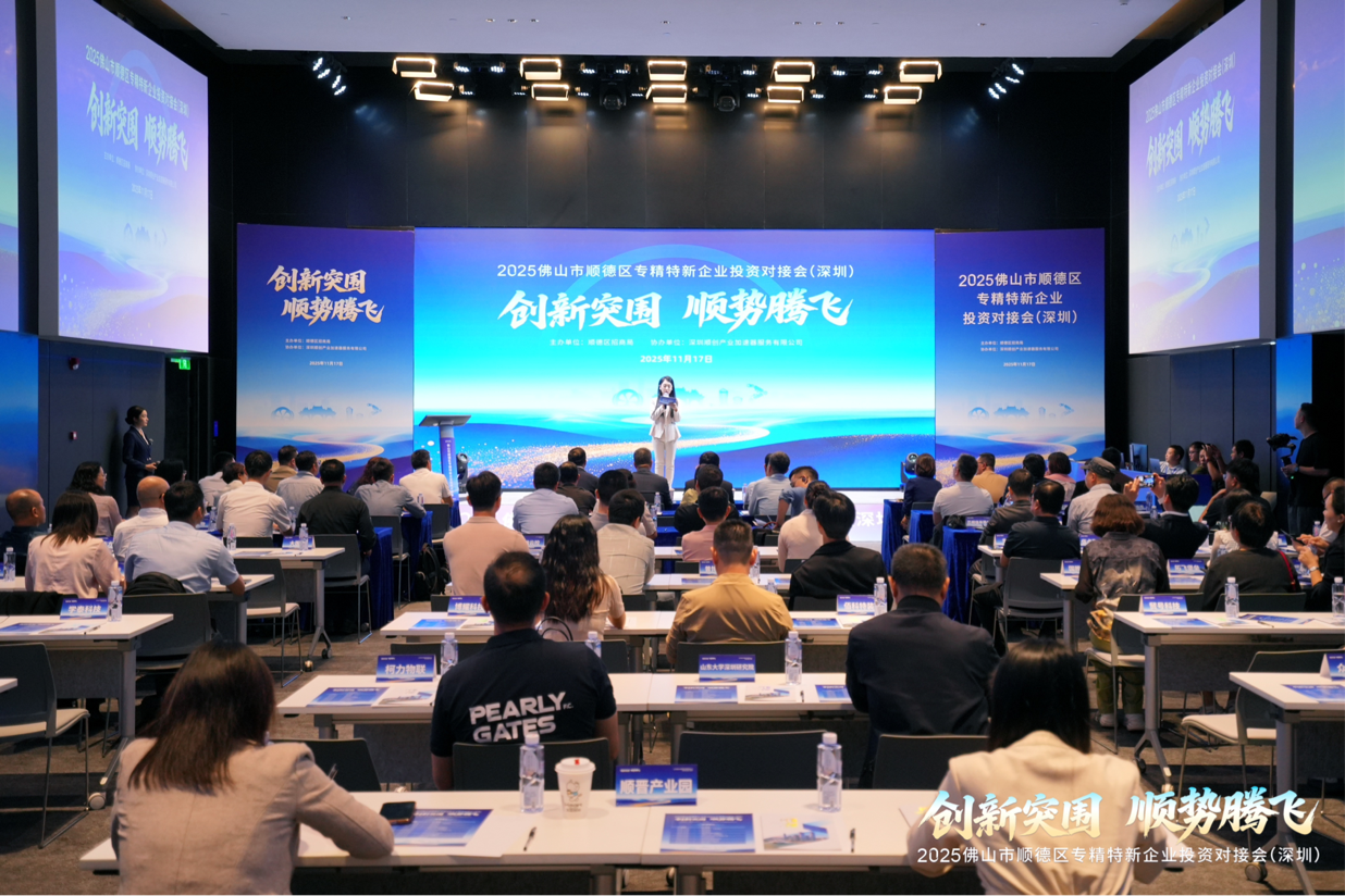11月17日下午,由顺德区招商局主办的“创新突围,顺势腾飞——2025佛山市顺德区专精特新企业投资对接会”在深圳举行,近100家来自半导体、新能源、智能装备等领域的专精特新企业代表、商协会代表,与政府、产业、资本及媒体人士共聚一堂,共同探寻湾区产业协同的新路径。