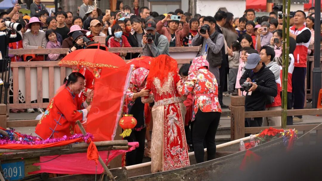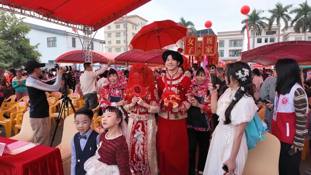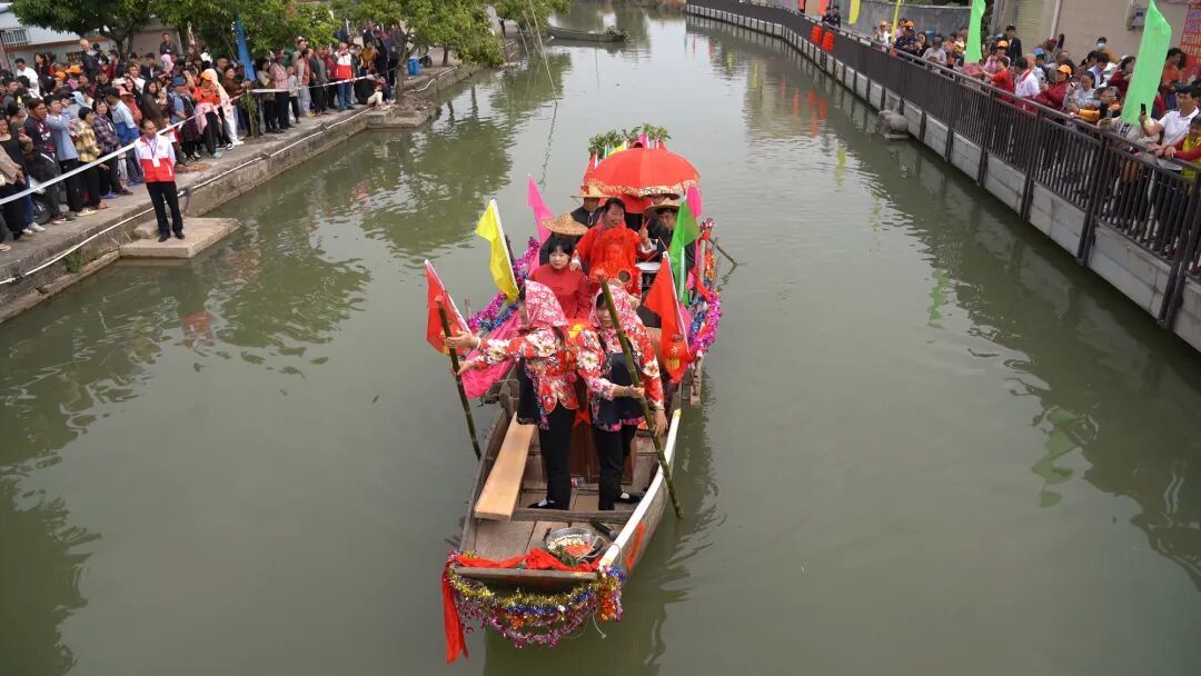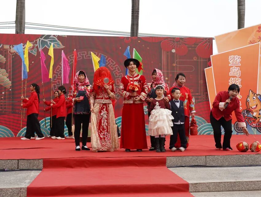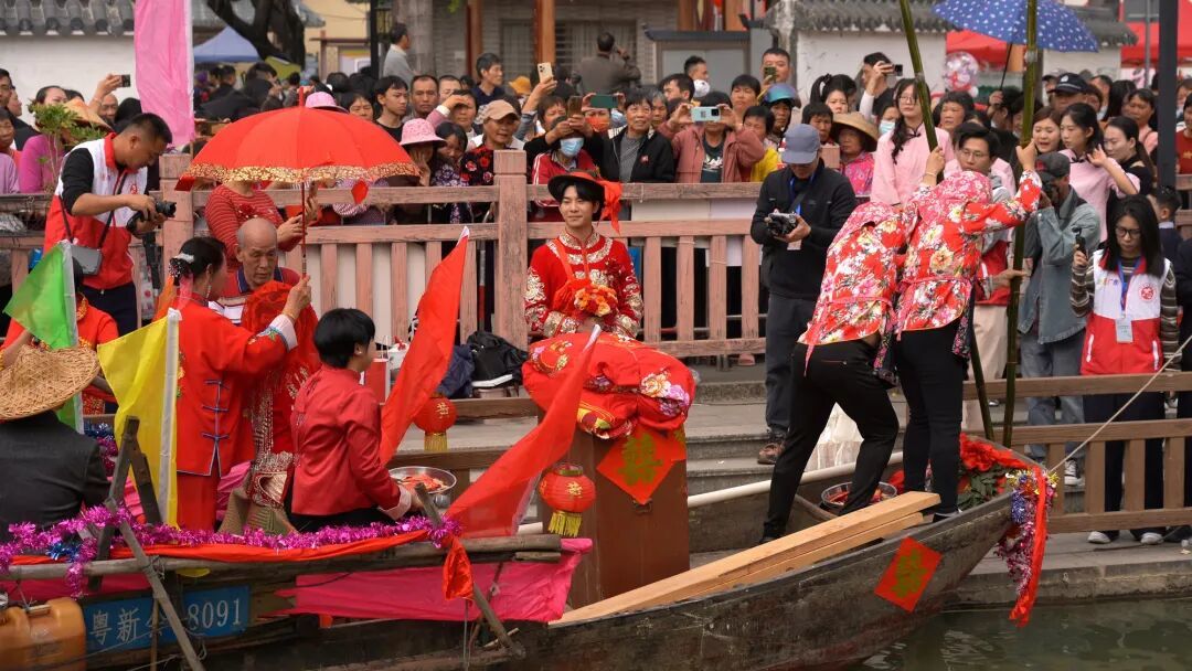 尤其引人注目的是充满疍家风情的“水上婚礼”迎亲秀。在主会场附近的大滘河面上,一艘装饰着红绸与喜字的疍家渔船缓缓驶来。船上唢呐悠扬,新人依循传统婚俗行礼,疍家婚俗在碧波之上生动演绎,为观众带来沉浸式的水乡民俗体验。“水上婚礼”完成后,各地游客和本地群众欢聚百席渔家喜宴,品尝水乡特色美食,参加“喜宴”添喜庆,气氛融治又热闹。