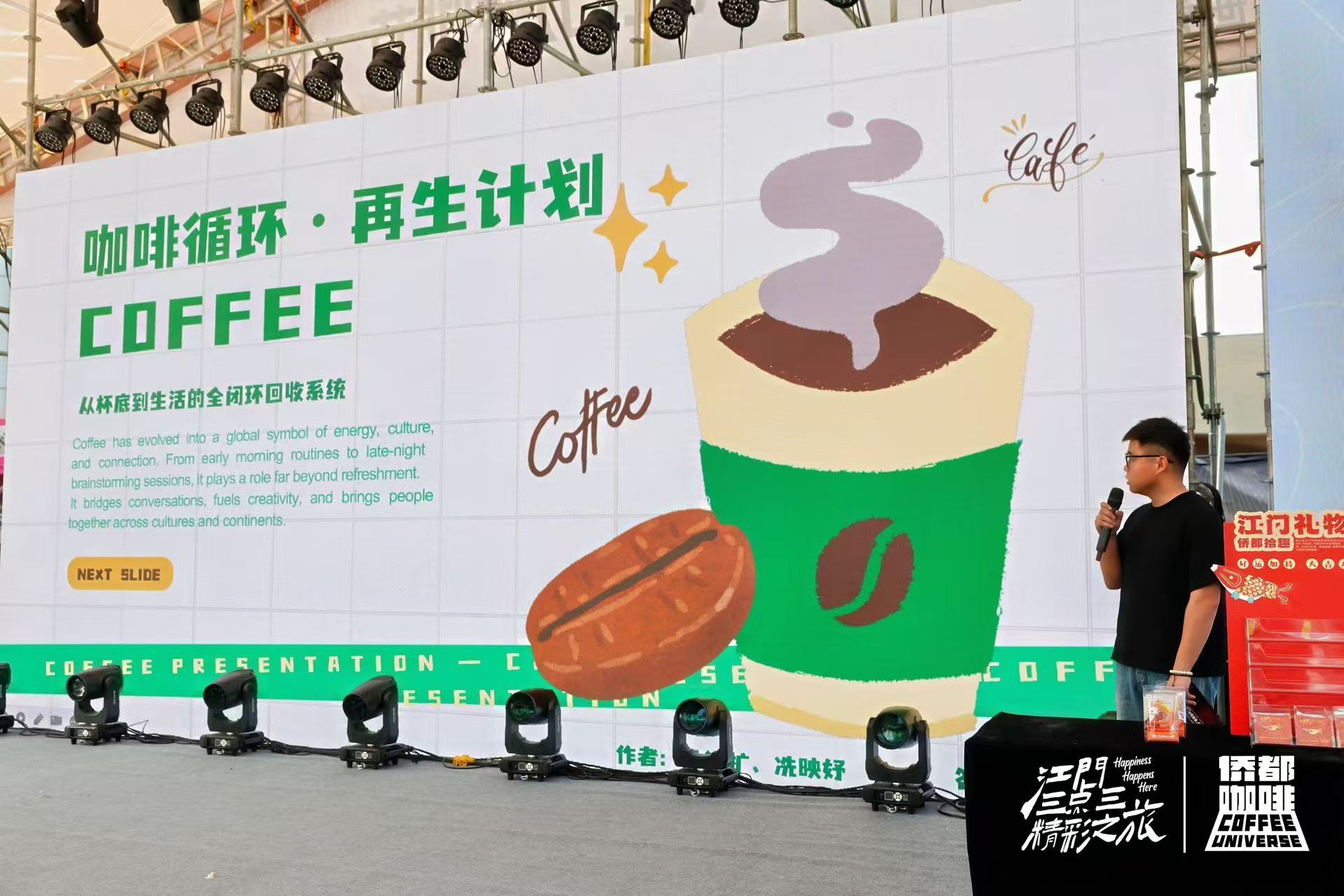 五邑大学的学生团队以“废弃咖啡渣的重生计划”为主题,展示咖啡渣环保回收的产业设计,彰显年轻一代的绿色创造力。